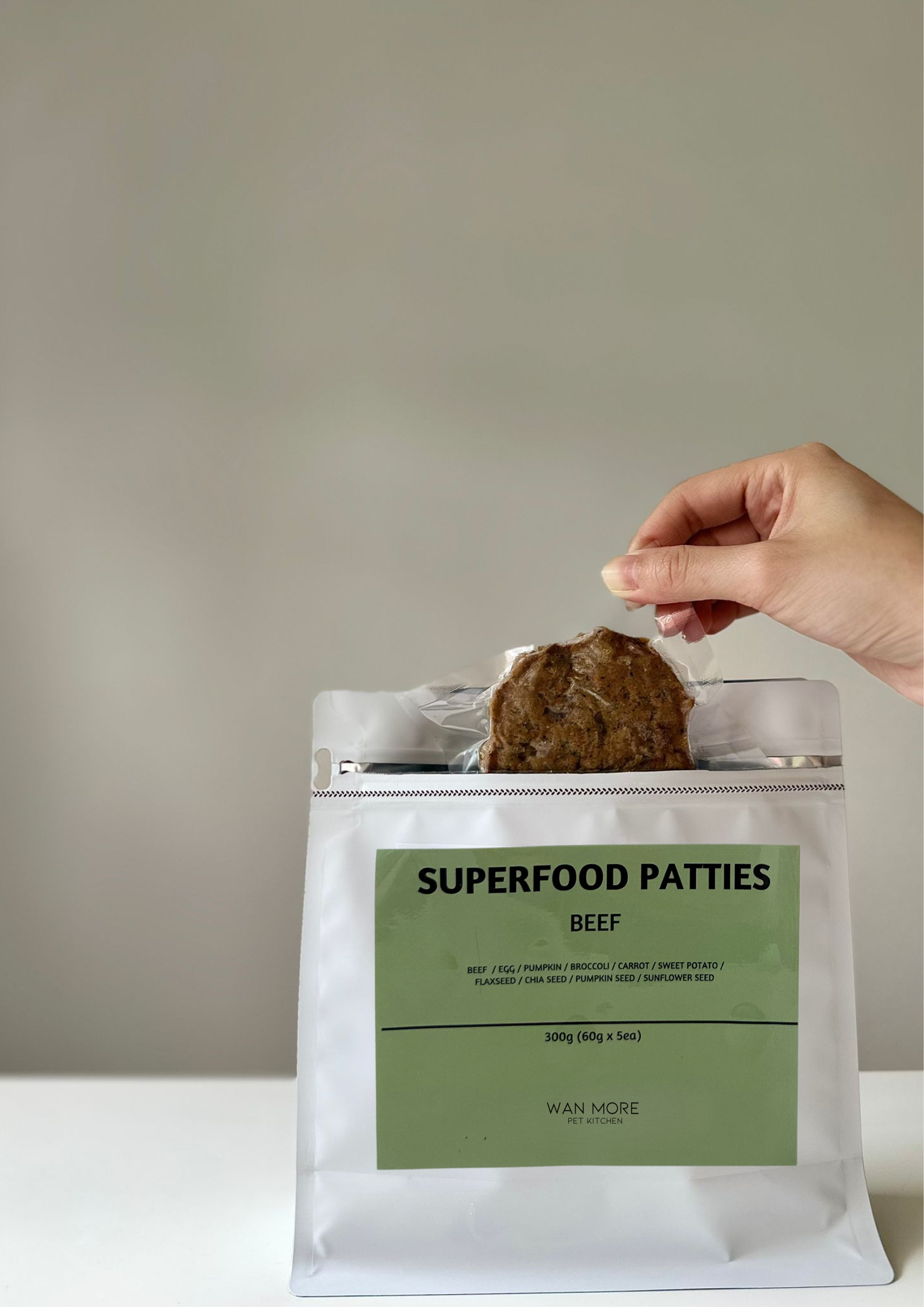 Unleash your dog's inner superhero with our Beef Superfood Patties! Made with top-quality lean beef and packed with superfood ingredients like flaxseed, chia seed, and a variety of veggies, these patties are the perfect meal for your furry friend. Fuel their energy and health with every delicious bite!